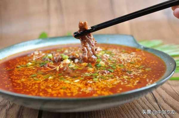 4.锅留少许油烧热,先下姜末、蒜末、细豆瓣酱、自制刀口辣椒等炒香,再掺入鲜汤并调入盐、味精和鸡精烧开,淋入水淀粉勾成米汤芡后,加花椒油和香油搅匀,然后放入牛肉条烧入味,最后起锅装盘,淋上热油并撒芝麻和葱花,即可。