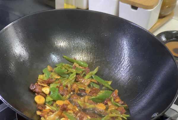 步骤2:然后加入青辣椒翻炒片刻。