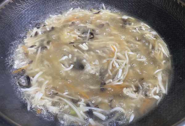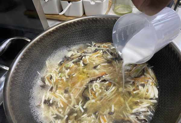 第三步:加入适量热水烧开,煮3分钟,倒入水淀粉勾芡。