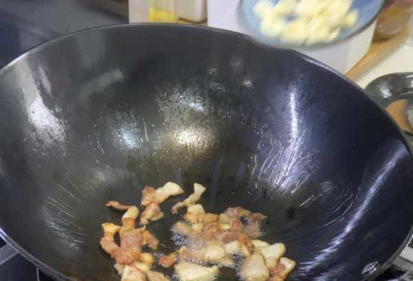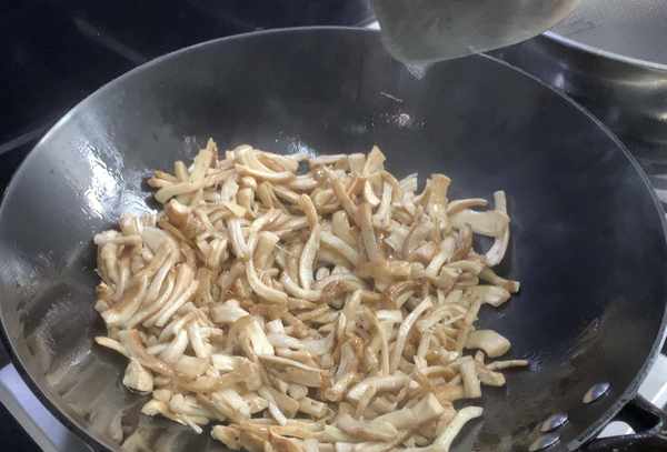 第一步:将香菇腿洗净,用手切成小块。然后锅里放油烧热,放入香菇腿翻炒片刻至水收干。