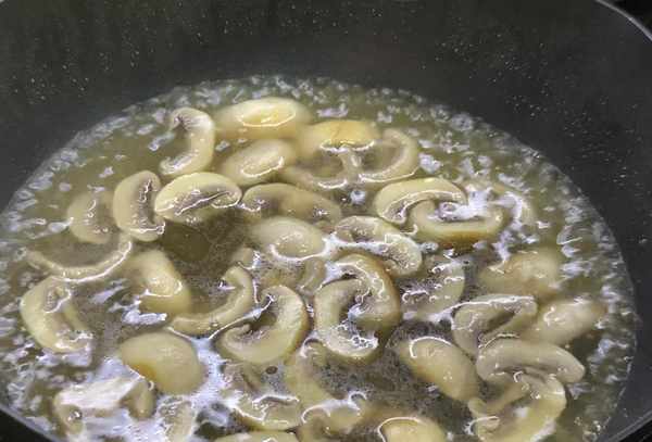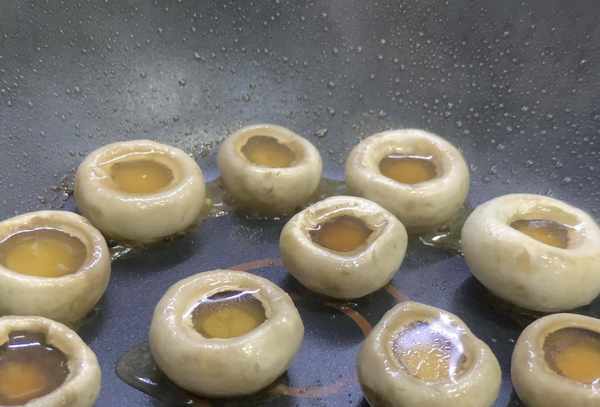 步骤2:将1汤匙猪油放入锅中加热融化,然后将香菇嘴朝上翻炒片刻。