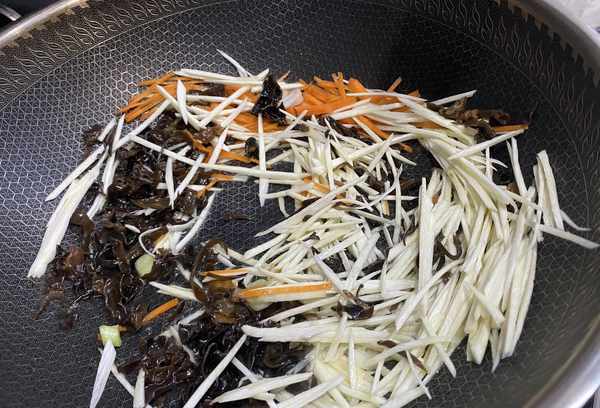 Step2:锅里放油烧热,加入黑蘑菇、茭白和红萝卜丝翻炒片刻。