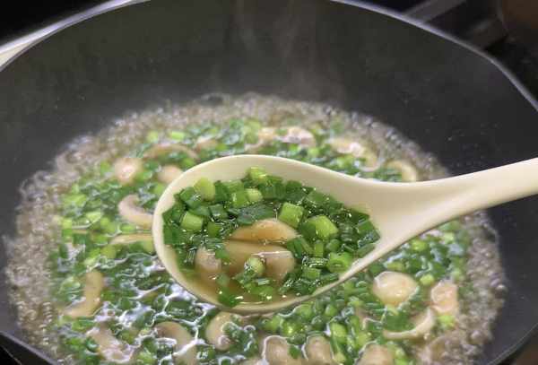 第四步:最后倒入蛋液煮熟,加入盐和鸡精调味,撒上一些葱花。