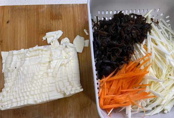 第一步:豆腐磨碎,香菇泡发后磨碎,胡萝卜和水竹磨碎备用。