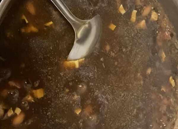 13.加入高汤~料都沉底了,原谅我黑锅的汤……哈哈哈,加入骨高汤烧开,加入煮好的花生、牛肉粒和面筋继续煮。