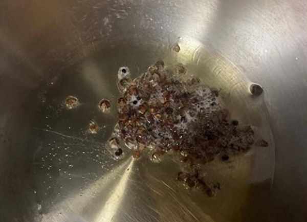 10.倒入油,小火将花椒丸炸熟。香味出来后,将花椒球沥干,留下花椒油。