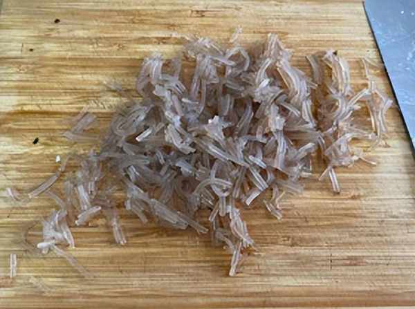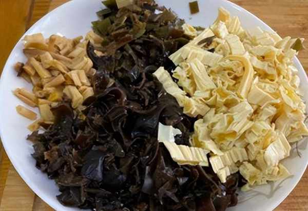 6、海带、百合、香菇、枣芭和面条先用热水泡好,切块(不要切成大块,最好切碎!)