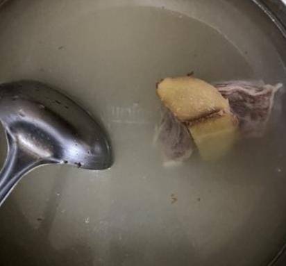 5.将大骨取下的棒子放入冷水锅中,煮去浮沫,加入姜末、葱花、八角,用小火慢炖。炖汤的时候,就可以开始准备食材了。