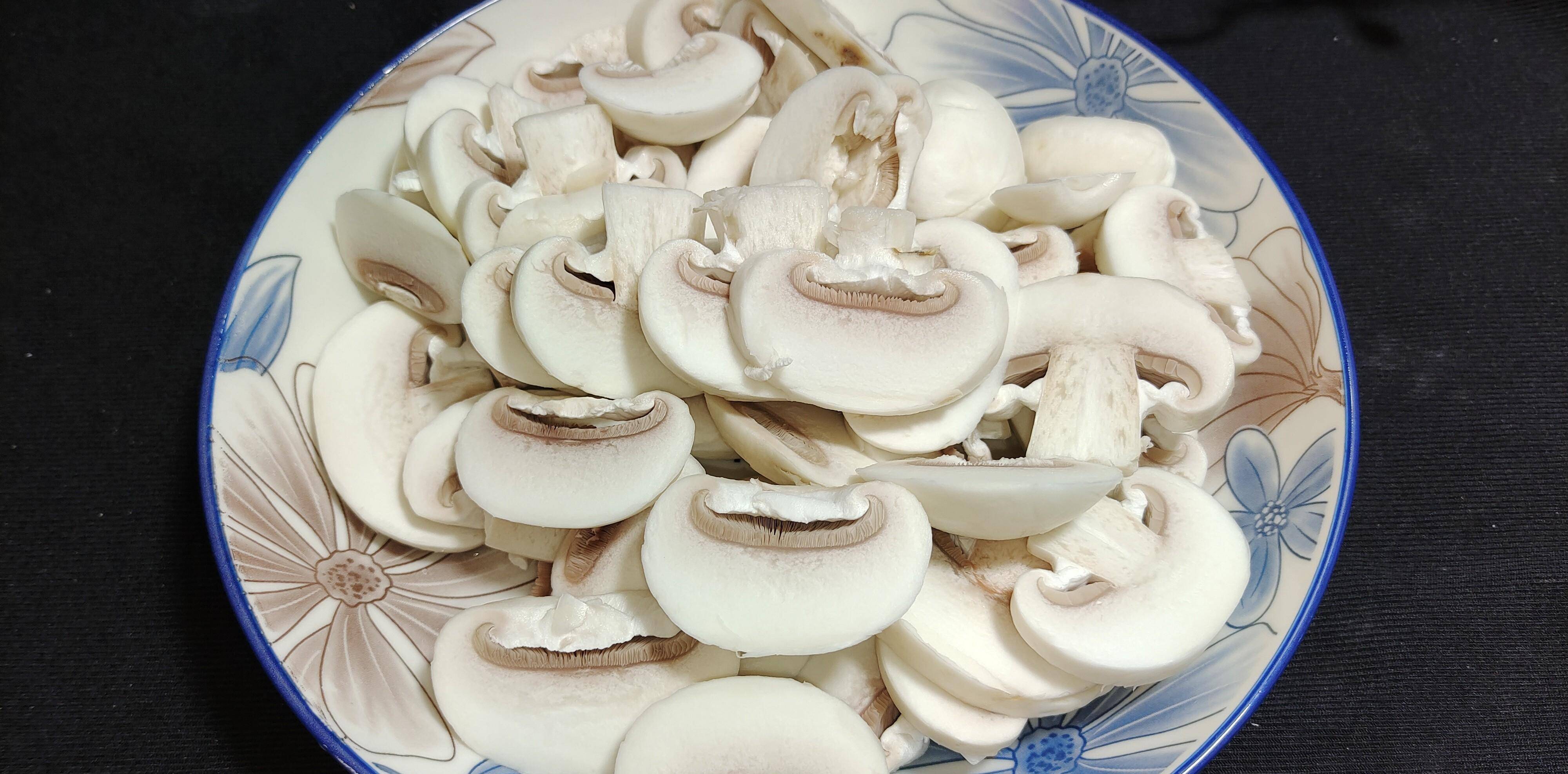 第二步:再准备一打左右的口蘑,洗净切片待用,再准备西红柿丁和肉末一块待用。配料少,只需要准备鳞茎和生姜。