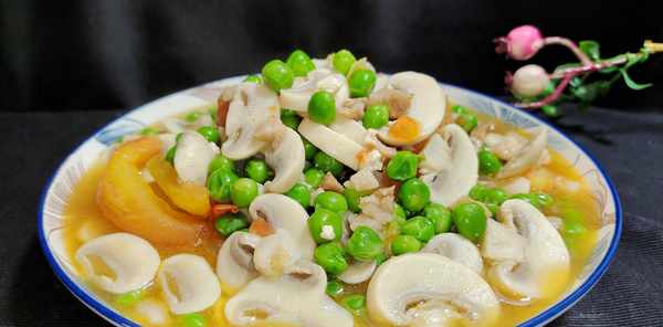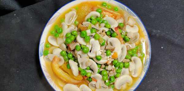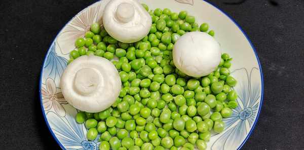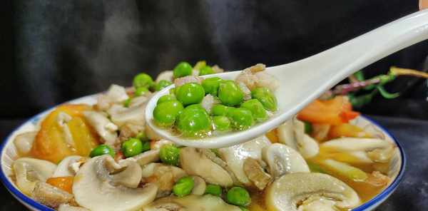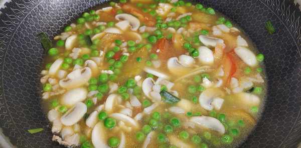 第5步:煮沸后,将豌豆和蘑菇加入锅中,煮约8分钟。豌豆必须完全煮熟。最后撒上鸡精提鲜提味,再加入少许水淀粉勾芡。
