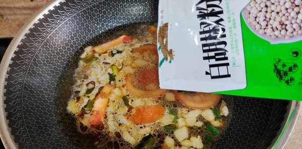 第四步:然后加入番茄块翻炒均匀,盖上生抽翻炒片刻,加入约2碗开水,加盐和胡椒粉调味,烧开。
