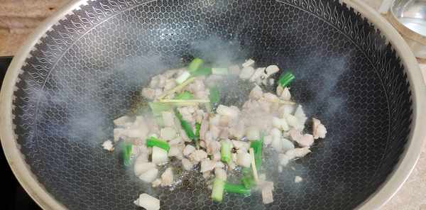 第三步:锅中烧热适量食用油,先将肉末放入锅中炸至完全变色,然后加入葱姜炒匀,炒出葱姜的香味。