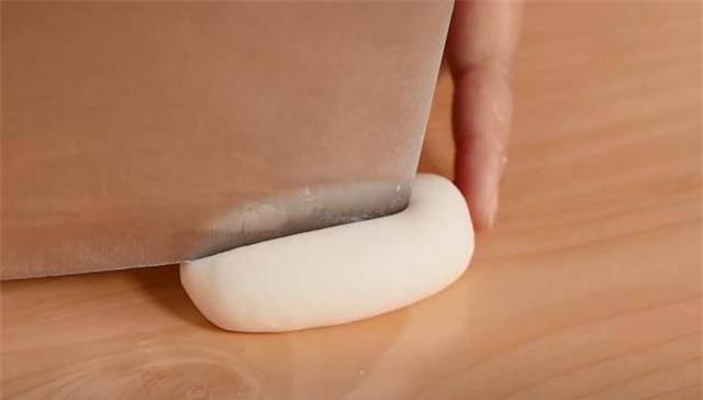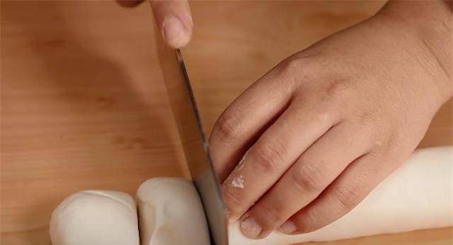 3、面团切好后,就可以开始整形了。首先,将其揉成匀称的状态即可。揉好后,我们把它切成两半。小心不要切断顶部。