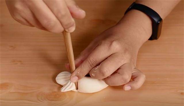 10、鱼鳍的部分,在靠近腹部的两边搓出一点点面团,这样我们的形状就出来了。
