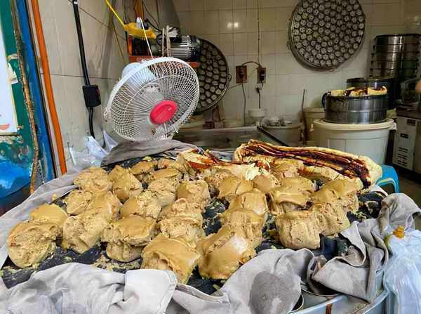 每一家做碗耳糕的店铺都有细微的不同,但是大致是一样的,这家店铺用的材料有红糖、粘米、芝麻等。红糖和粘米都要先稀释一番,搅成均匀且粘稠的时尚,然后再按照一定的比例,把红糖和粘米混合在一起,芝麻等其它材料,是在倒入模具之后才加进去的。这个活一般都是由老板娘来做的。