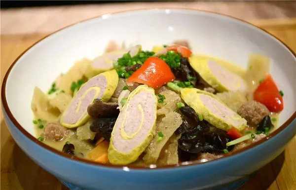 排名第六的是湖南酒席上最常见的合菜,也叫全家福,有上十种的食材放在一起煮制而成,比如最常见的猪肉,肉丸子,火腿肠,木耳,香菇,鹌鹑蛋,炸猪皮,芹菜等,此菜不管大人小孩老人都非常喜欢,也是头碗,一般只有在酒席上才能看到,平常吃这个菜的人很少,