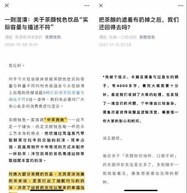 一年之后,又有顾客质疑茶颜悦色的茶饮分量不足,2021年10月,茶颜悦色通过微博对此做出回应。2021年11月,茶颜悦色又通过官方公众号发布了一篇文章《把茶颜的遮羞布扔掉之后,我们还回得去吗?》,对“偷工减料”的说法再次做出回应。