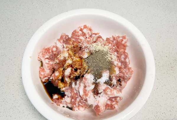 2.猪肉剁碎,加入蒜姜、盐、生抽、老抽、鸡精、黑胡椒,用筷子用力搅散汁。