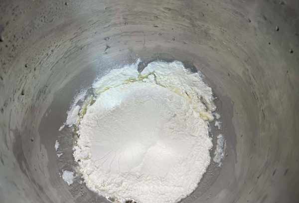 5.接下来准备意大利面。春天的天气既不太冷也不太热。特别适用于馒头等发酵食品的擦洗。将面粉、发酵粉、糖和水充分混合,倒入面粉面团中。