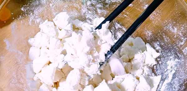 我们用铁棒取锅,剁碎,放入碗中,加入两勺面粉,摇匀,将面粉完全盖住马铃薯种子,放在一边。