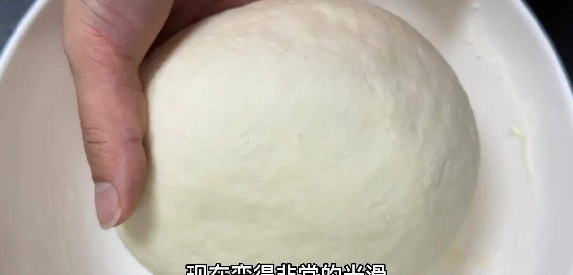 静止的面团感觉有点湿,现在可以很好地抚平了。所以想要面团揉的顺滑,不是技术好不好,而是掌握好方法。