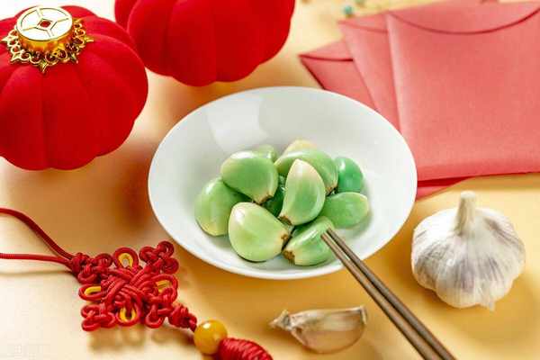 4、腌制腊八蒜时,温度越高其绿变速度越快,一旦绿变就需要在0~4℃低温条件下贮藏。温度过高,蒜的绿色素降解速度加快,质地变软,会失去爽脆的口感;温度低于0℃,同样会影响腊八蒜的品质。