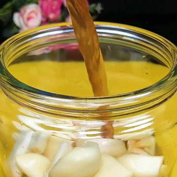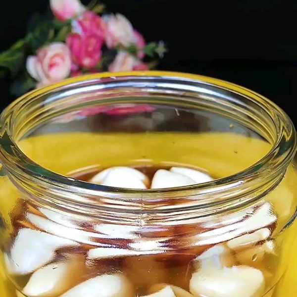 6、把处理好的大蒜放入瓶子中,然后倒入米醋没过大蒜,个人认为米醋腌出的腊八蒜才是最香的,即没有陈醋那股特别酸的气质,也没有蒜本身那股辛辣的气质,最后的成品口感会很柔和。