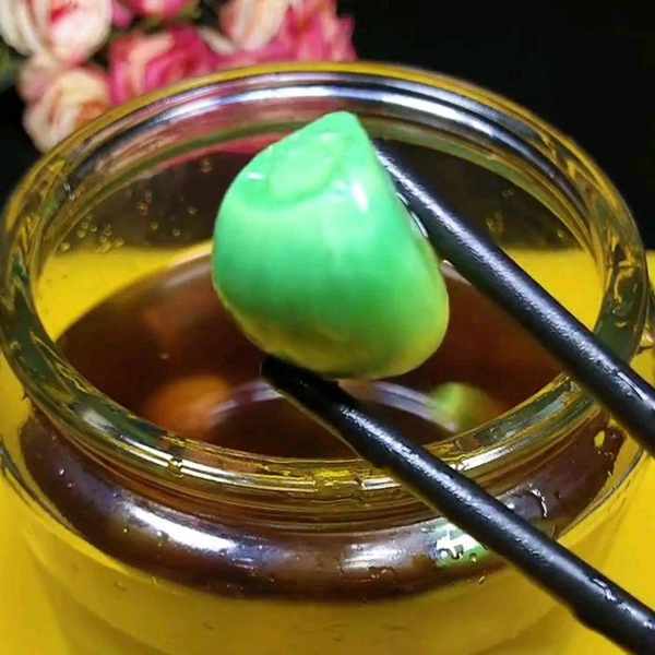 7、要想腊八蒜腌的时候绿得快还好吃,就一定要放入5克的白糖和大概5滴的白酒,这是1斤大蒜的比例。