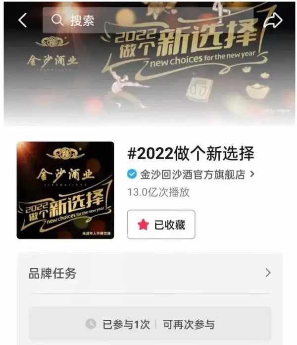 2022年8月19日,金沙酒业与抖音短视频平台携手发起#2022做个新选择#话题挑战赛。参与活动的福利包括摘要酒生肖版和金沙纪念酒1951等。10天时间,话题播放量即突破13亿次!声量相当之大。