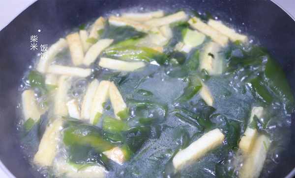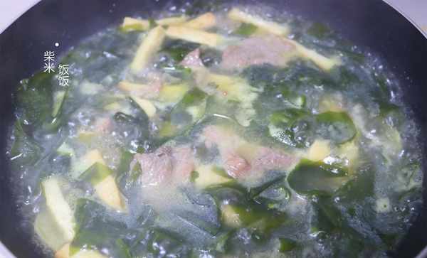 5,接着把处理好的裙带菜倒进来,盖上盖子,中大火煮3分钟。
