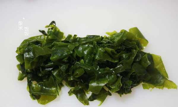 1,裙带菜放在温水里浸泡,大概十分钟就可以泡发。用清水淘洗一遍,沥干水分后切成小块。