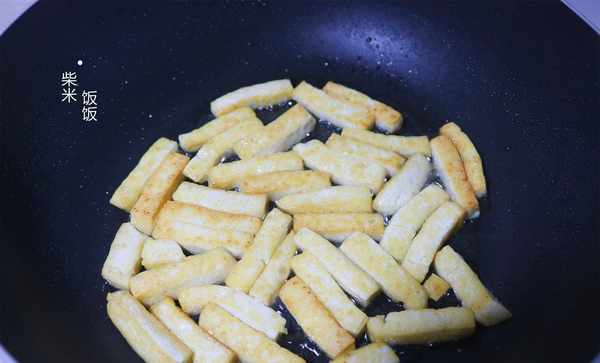 3,豆腐切成粗条。热锅倒入少许油,油热后放入豆腐,中小火煎至四面金黄。