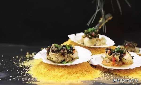 2、扇贝肉调入黑胡椒碎5克、黑松露盐2克、米酒15克、橙皮末10克腌渍15分钟,放入扇贝壳中,入蒸箱蒸5分钟。