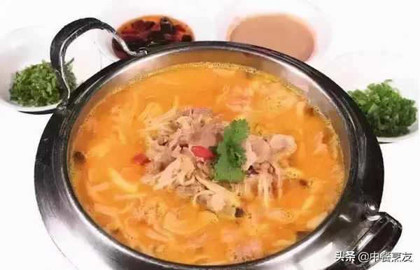 3、锅下底油烧热,下小葱段、姜片各5克爆锅,倒入豆汤400克、羊汤200克烧开,调入南瓜茸20克熬透,打掉残余的豆粒,加入提前泡透的水晶粉100克、汆过水的菇类,调入盐5克、白醋5克、胡椒粉3克、白糖2克、鸡粉2克烧开,下羊肉同煮1分钟,起锅装入明炉,带香菜末、香葱末、油辣椒、芝麻酱各一碟上桌。
