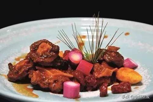 4、下煎上色的牛尾,调入盐3克、黑胡椒粒4克、老抽15克,微火熬2小时,捞出牛尾肉,放入胡萝卜块、土豆块、白萝卜块各50克,小火炖30分钟,再放入牛尾肉炖10分钟,捞出装盘,走菜即可。
