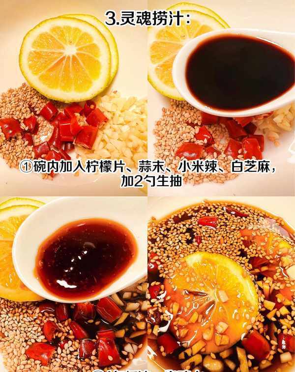 3、魂汁:将柠檬片、蒜末、辣小米、白芝麻放入碗中,加2勺生抽、1勺蚝油和半碗水。