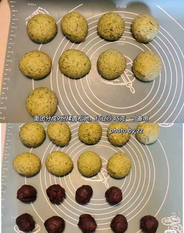 2、面团揉面发酵2小时,分成9份,揉面静置10分钟,擀平铺上红豆馅,擀成圆形,压在另一张烤盘上发酵。