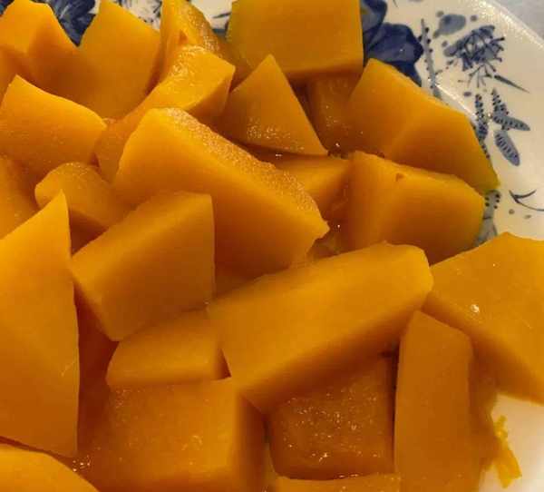 第一步,把南瓜去掉蒂,皮,切开掏出瓤,用清水洗干净。然后把南瓜切成小块,放入蒸锅中蒸熟。
