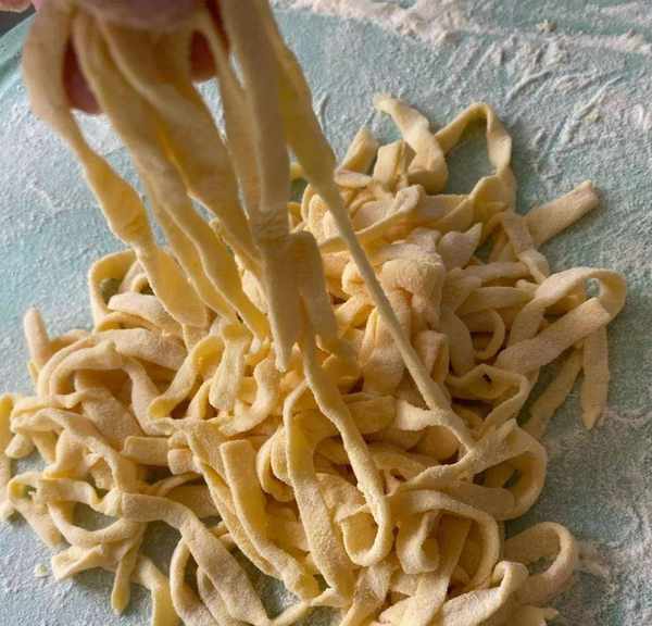 第三步,把面团揉透,先擀成面皮,然后切成面条。擀的时候,要在面板上多撒一些干面,以免黏连。