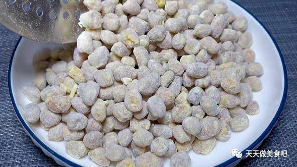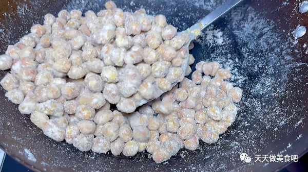 2.搅均后,再加入少许食盐、再加入适量的面粉,再次搅拌均匀,使花生米裹上一层面粉,面粉一定要少量多次的添加,最后用漏勺过滤一下,过滤出多余的面粉。