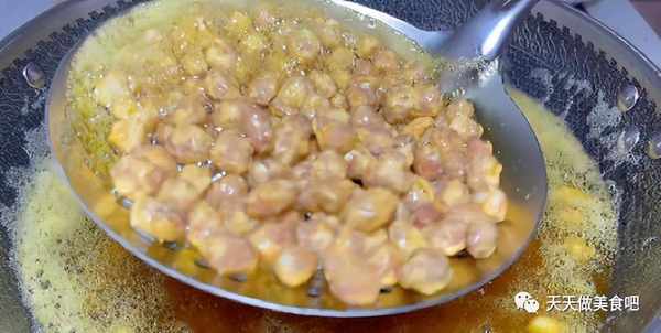 4.炸至五分钟后,把油温升高,用勺子不停的翻动,当油锅内出现噼里啪啦的炸裂声时,捞出沥油备用。