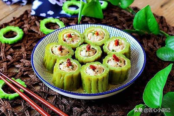 美食小贴士:挖苦瓜瓤时,不要全部挖掉,下面留薄薄的一层瓜瓤垫底;肉沫腌制时朝一个方向搅动,使肉沫吃起来更滑嫩筋道。
