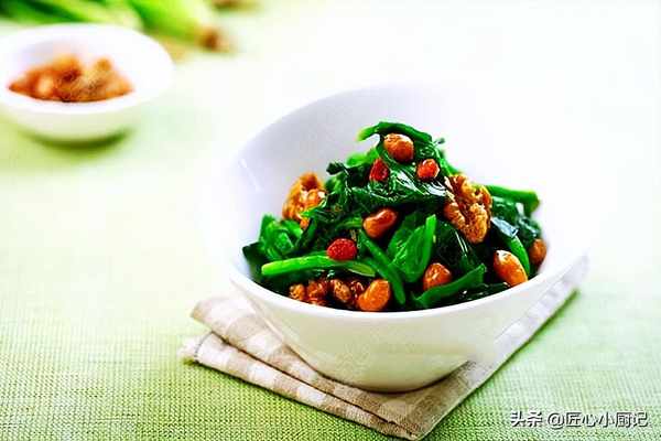 所需食材:菠菜,花生仁,核桃仁,蒜沫,枸杞