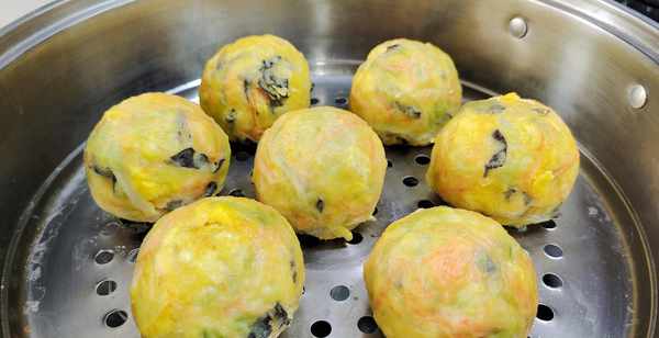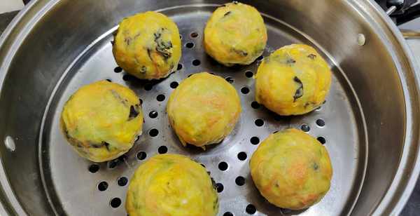 第七步:所有菜团子上蒸锅大火蒸10分钟左右就完全熟透了,出锅后稍微冷却一番就可以开吃了。