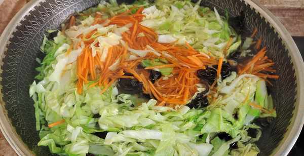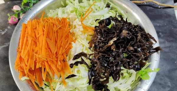 第一步:卷心菜半颗切丝清洗干净,胡萝卜小半个切丝,干木耳少许用温水充分的泡发,再切碎备用。
