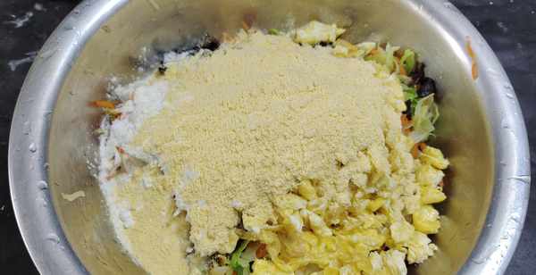 第四步:将焯水后的所有蔬菜放入干净的盆中,再加入鸡蛋碎,调味只加食盐,鸡精,少许香油即可,再加入干玉米粉50克和面粉50克充分的搅拌均匀。