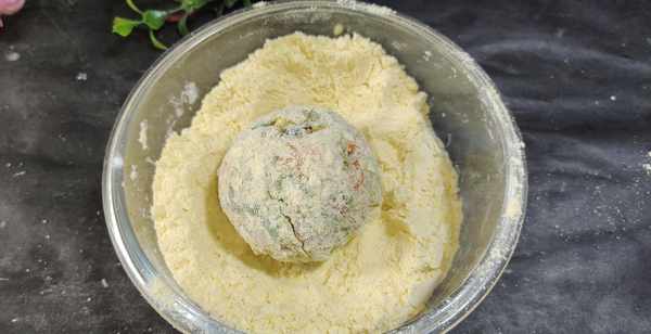第六步:准备一勺玉米粉和一勺干淀粉搅拌均匀成混合面粉,将团好的蔬菜团子在混合面粉中滚一滚,再团一团,而后再放入混合粉中滚一滚,多滚几次,直至表面均匀的沾一层粉即可。