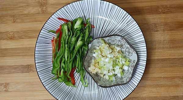 【步骤二】:把青红椒去籽改刀切成丝、大蒜和大葱都切成末,分别装盘备用。