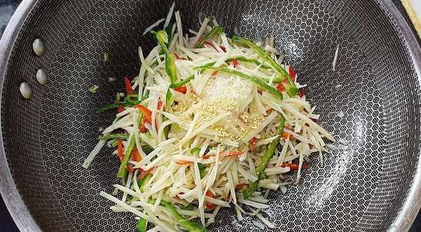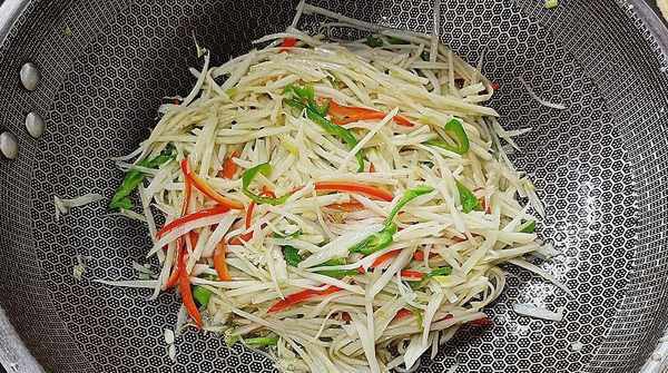 【步骤七】:开大火翻炒,让调料和藕丝充分融合入味。