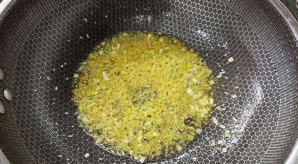 【步骤五】:炒锅中放入一勺油烧热,开小火把葱蒜倒里边,炒出香味。